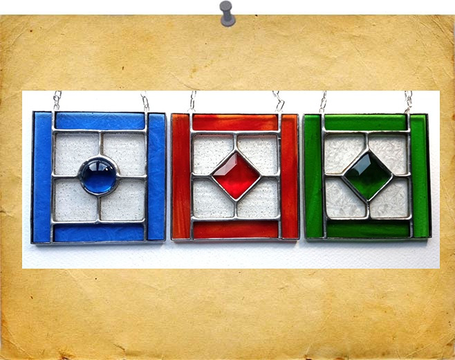 A range of small hanging square panels featuring a coloured glass border surrounding textured glass and a central glass lens or prism in a matching colour.