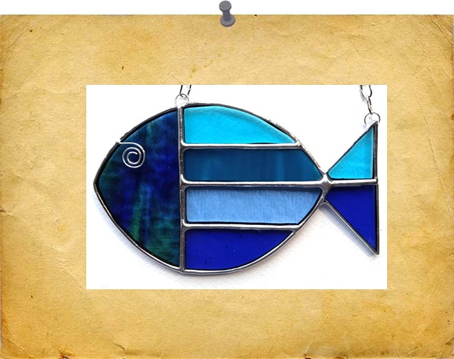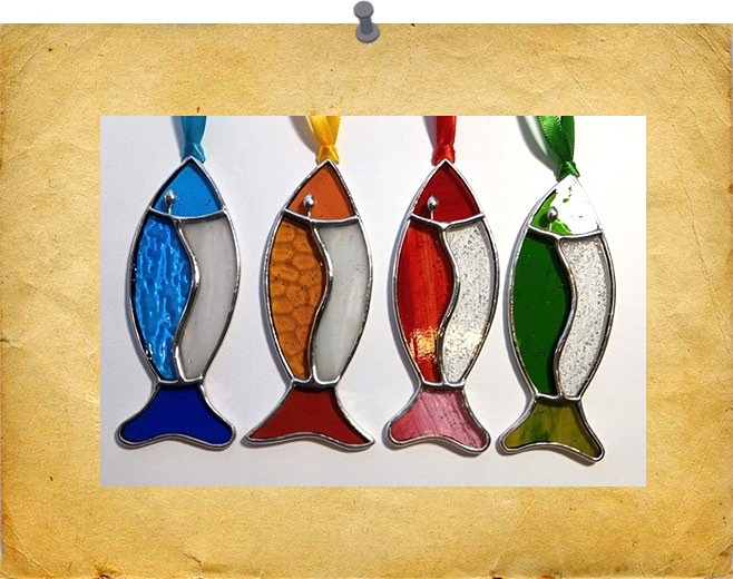 A range of small hanging Fish - each a mixtures of cloured and textured glass. Finished with a silvery solder for a shiny effect. Colours will vary