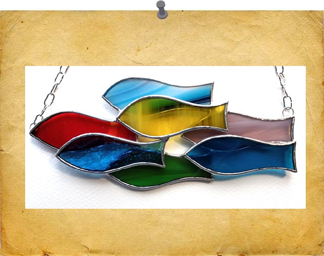 A hanging shoal of 7 fish. Colours will vary. Finished with a silvery solder for a shiny effect.