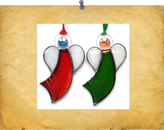 Fun angels with silver wire halo and decoration. Colours will vary. Finished with a silvery solder for a shiny effect.
