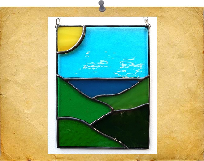 simple sunrise over a beach, using vibrant blues and yellows. Finished in a silvery solder to retain it's shine.