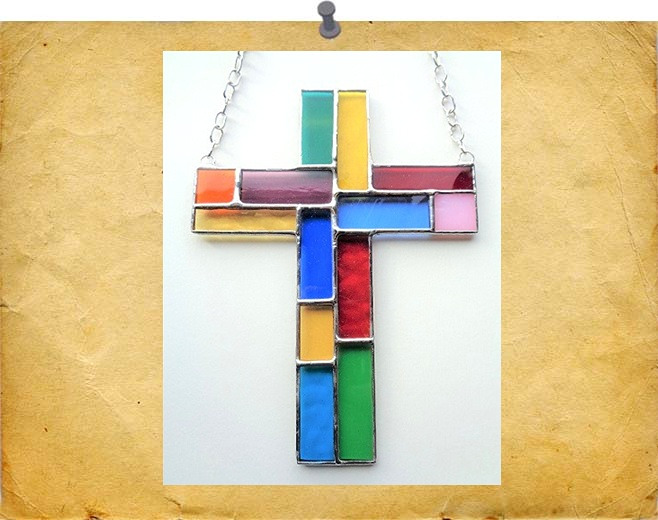 A beautiful cross made with a patchwork of multi-colours glass pieces. Colours will vary. Finished with a silvery solder for a shiny effect.