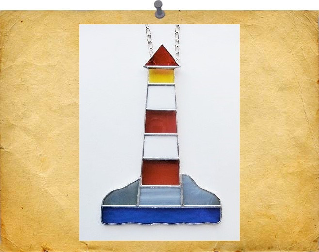 A traditional lighthouse on rocks and a strip of sea. Finished either with black patina and polished to a high gloss, or with silvery solder for a shiny finish.