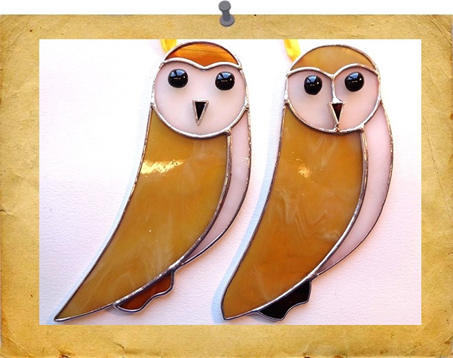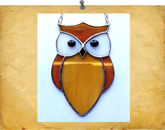 A beautiful courtyside owl, a native species. using a varied of brown wispy glass with glass nuggets for the eyes. Colour tones may vary. Finished with a silvery solder for a shiny effect.