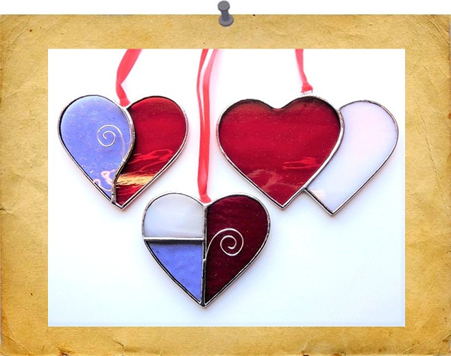A range of Hearts, some decorated with silver wire, and others having a central prism. Finished with a fine strip of lead edging.