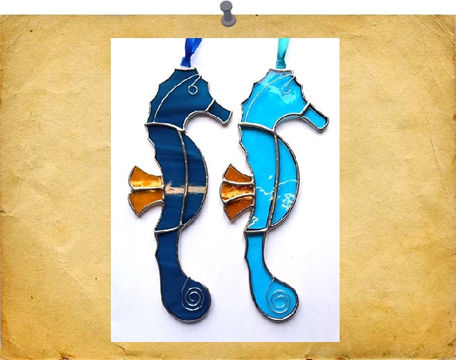 Beautiful but delicate sea horses using silvered wire to re-create the face and curled tail. Finished in a silvery solder. Colours will vary.